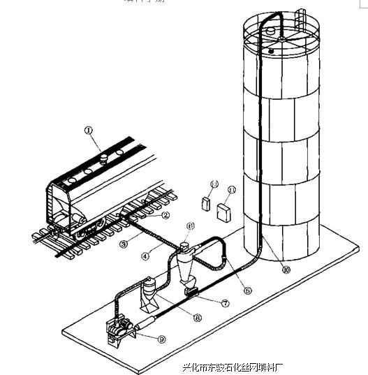 丝网除沫器填料可以用火车或卡车散装运输。图3-2是由Premie Pneumatics, Inc设计的用于火车的真空-压力卸料系统,各部分在图中作了说明。该公司可提供几种不同类型的体系4。带有双鼓风机、真空的系统处理量最大,达到45000kg/ho该系统装备了 PLC控制,配备了目的选择器和自动关闭装置。处理量为22000kg/h 的较小设备可单人操作。该设备具有嵌入式的水 压系统,它简化了连接车厢出口的附加装置和可 变速度驱动器,该驱动器可使操作者控制加料速 度。该公司可生产各种附件,如:带有各种转子 的Aemlock旋转阀计量器、分流阀、导管、连接 器、接头、闸阀、分离器和接收器、鼓风机。事 实上,设计和装配这些系统要求的每一种元件都 可提供。
