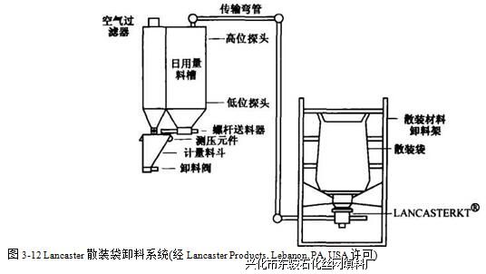 由于环境保护的需要,许多粉状材料要用半散装袋运送。这种半散装件很重,需要用设 备卸料。图3-12为一散装袋卸料系统,该系统将散装袋中的物料卸入配备称量料斗的储料箱中,可自动或半自动供应物料。