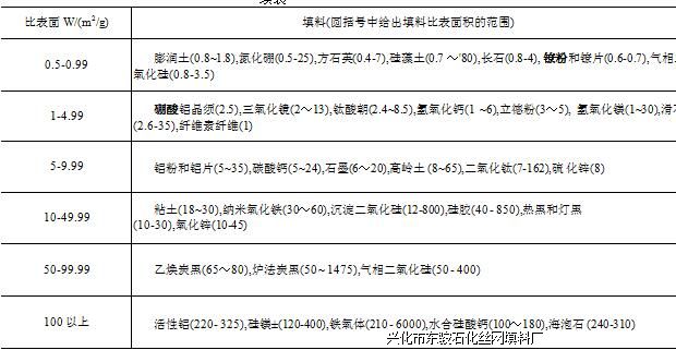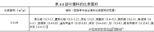 无孔大颗粒,如金属颗粒、热熔融制造的颗粒和玻璃珠,比表面积最低。紧随其后的是 矿物填料颗粒,尤其是劈裂成光滑晶体表面的矿物填料。有适当孔的小颗粒填料的比表面积 属中等。颗粒尺寸很小,聚集体和高孔隙率矿物有最大的比表面积。