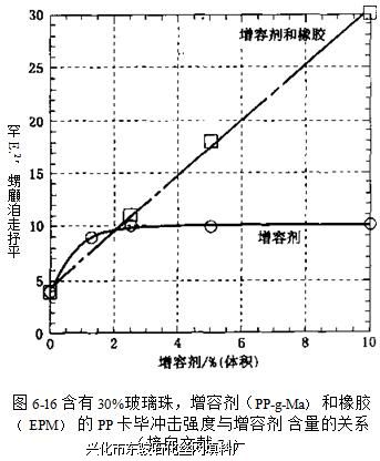以下将用例子说明改性引起变化的程度。图6 - 16为3 -氨基丙基三甲基硅烷玻璃球用 马来酸酊接枝聚丙烯(ExxelorP0 2011)改性后,对含增容剂和无官能团橡胶(EPM)的聚丙烯 卡毕(Charpy)冲击强度的影响。加入玻璃球的PP卡毕冲击强度从6kJ/m2下降到4kJ/m2,屈 服应力从32MPa下降到18MPao这是由于PP与带氨基的玻璃球之间的界面粘接性差的缘故。