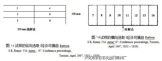 图7-5至7-7表示PP注塑板材中的 玻璃纤维分布%拉伸试样从注塑板材的 不同部位选出(图7-5和7-6)。纯PP的 模量虽低,但在整个注塑板的长度和宽度 方向上模量均匀。加入纤维后拉伸模量似 乎提高,但读数不太均匀。纤维一定优先 随注射料的前沿运动,因为通常靠近注射 点的部位模量最低,距离最远的部位模量 最髙。填料含量增加可提髙读数的均匀性(含有40%纤维的试样比含有20%纤维的试样读数 均匀)。滑石粉填充塑料的吹塑瓶n和滑石粉填充热塑性塑料的热成型产品具有类似的测试结果.