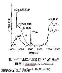 主要结果:图14-27比较了用硅烷处理和未处 理的Si()2的IR光谱.主要区别在于:未处理的SiO2 有许多仃能团,而处理后官能团很少。人们发现拉曼 光谱在确定SiO2及其他填料的官能团方面非常有 用口,图14-28表示应变对芳纶纤维拉曼谱带偏移的 影响当施加应变时,1610和1645cnr'处的两个主要谱带明显地向较低的波数偏移。进 一步的研究表明,应变与1610cn「‘谱带偏移行很好的线性关系。文献报道了用漫反射IR测 定高岭土和改性高岭土的基团类型’新,用IR光谱可以很容易地确认体系中含有的滑石 粉89」32。用FFIR可以监测碳纤维的氧化(图14 - 29), IR光谱图上有两个峰(1720和 1580cm-1), t:们与处理时间呈线性关系
