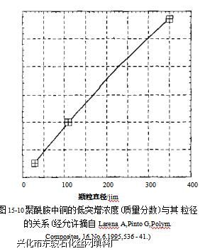 在导电应用领域中,聚酰胺中要么添 加碳纤维,要么添加石墨。其应用领域包 括商用机器(复印机、计算机打印机),电 器包装,地毯纤维,以及EMI屏蔽等。其 他填料如镣包覆石墨、不锈钢纤维、铝片 以及喷涂金属的玻璃并不常用。聚酰胺是 最好的EMI屏蔽材料之一,仅填充15%镣 涂覆玻璃纤维,复合材料就表现出了 50dB 的衰减作用。经对比分析,聚酰胺中加入 30%的石墨纤维仅出现30dB的衰减作用。 图15-10所示为粒径对电阻率的影响"°。 一般填充材料表现出的规律是随导电颗粒 的粒径减小,最终复合材料的导电率提高。 填充纤维的导电材料表现的规律较复杂, 与填料的种类有关。