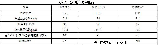(2)物化性能该纤维属于芳香族一脂肪族聚酰胺纤维,其物化性能介于普通聚酰胺 纤维和聚酯纤维之间。如它能耐较高的温度,又耐磨,用于制作轮胎窗子线,不具有…般聚 酰胺纤维所具有的“平点现象”。其短纤维的力学性能见表2-12。