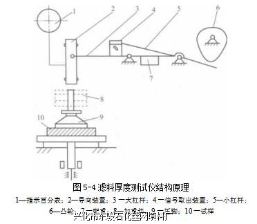 丝网除沫器滤料的厚度采用织物厚度测试仪进行测定,如图5-4所示。试样的尺寸大小,要求比厚 度仪的压脚面积大20%以上,试样为5〜10块。在测试厚度时,将经过调湿处理的试样放 在厚度仪的平台上,根据测试时所采用的试验标准,针对不同类型的产品,逐渐增加载荷到 所要求的数值。由凸轮的转动大、小半径使小杠杆做上下运动,从而使大杠杆上下摆动而带 动导向装置做上下运动。当凸轮大半径接触转子时压脚上升,当小半径接触转子时压脚下 降,压在试样上,通过指示百分表显示试样的厚度值,然后稳定在30〜40s,再记录厚度读 数,要求精确到0. 001 (厚度在0. 5mm以下时)~0.01mm (厚度超过0.5mm时)。并在 测定报告上标出所加的载荷数(如重块的质量)。