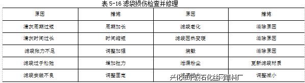 引起滤袋堵塞的原因,可由表5-15所列的现象进行检查和维修。一般可采用如下措施: ①暂时地加强清灰以消除堵塞;②部分或全部更换滤袋;③调整安装与运作条件。