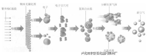 光催化剂也称光触媒,在光的照射下自身不起变化,却可以促进化学反应,是具有催化功能的半导体材料的总称。光催化剂技术是近几年发展较快的一项技术。激发光源和催化剂 是引发光催化反应的必备条件。目前激发光源一般采用紫外波段,少数催化剂可以直接利用 可见或红外波段,二氧化钛是最早也是最典型的应用于空气净化的光催化剂。在特定波长光 源紫外线作用下,光源的能量激发Ti()2周围的分子产生活性极强的自由基。这些自由基可以分解大部分有机物质与部分无机物质,同时破坏细菌的细菌膜,使细胞质流失,进而杀死 细菌。光催化剂空气净化技术流程见图6-4。