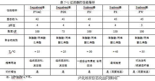 过滤器的性能指标见表7-1。表7-1列出的聚合物都是共聚物,即聚合物结构中包含两种单体。如果仅仅有一种单体,则聚合物是一种共聚物。通常过滤介质晶格中的树脂是共聚物。