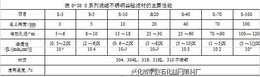 S系列烧结不锈钢丝毡滤料的主要性能见表8-380