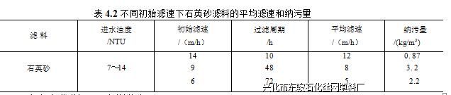利用有效过滤周期内滤速的变化关系,通过积分计算,同样可得出不同初始滤速和进水浊度下石英砂滤床在丝网除沫器有效过滤期内的平均滤速和单位滤料体积的纳污量,列于 表4. 2。对比表3.1和表4. 2可以看出,长纤维滤料在各种初始滤速下,平均滤速和 纳污量均远大于石英砂过滤;由表4. 2还可看出,石英砂滤料在滤速为9m/h的条件 下过滤效果最为理想,这也与水厂石英砂滤池目前实际运行的8〜10m/h滤速相 一致⑴。