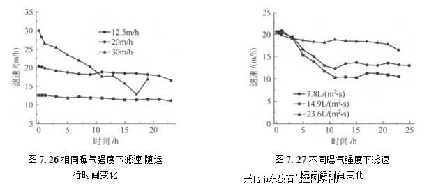 图7. 26和图7. 27为不同运行工况下周期内滤速变化曲线。可以看出,滤速变化 规律受初始滤速和曝气强度的影响。在同一曝气强度下,随过滤进行,滤速呈下降趋 势,且初始滤速不同,下降速率亦不同。低滤速下,始末变化不大;高滤速时,滤速 近似直线下降,周期末又有所回升。曝气强度改变,滤速变化规律亦有差别。曝气强