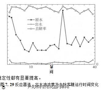 为分析反应器去除污染物的沿程变化规律,采用尺度较大的纤维除油反应器,主 体设三个取样口,分别距除油反应器底部30cm、60cm、90cm,将其分为下部、中下 部、中部与上部四部分。过滤滤速取20m/h,曝气强度为14.9L/(m2 • s)。