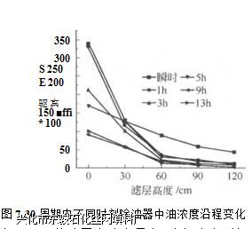 图7.30为周期内瞬时、lh、3h、5h、’ 9h、13h时油浓度的沿程变化情况。可以 看出,同一时刻,反应器内油浓度沿滤层降低,各层去除率沿滤层自上而下逐渐减