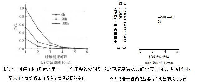 由图5.4中各过滤条件下纤维床层中滤液浓度的分布可见,随着过滤过程的进 行,长纤维高速过滤器滤床中,积泥逐层向滤床深处推移,直至整个滤床“衰竭”。 此种情况一方面表明长纤维高速过滤器具有典型的“理想滤层”的深层过滤的特征; 另一方面也说明,随着过滤过程的进行,纤维的压缩程度和滤层内积泥量均不断增 加,已附着在滤层表面的截留积泥受到水流的剪切作用也逐渐加大,当水力剪切作用 大于已附着悬浮物的结合强度时,已截留的悬浮物将发生剥离,此时该层滤料对悬浮 颗粒的截留作用达到“饱和”,理论上对滤液浊度的去除率将降为零。