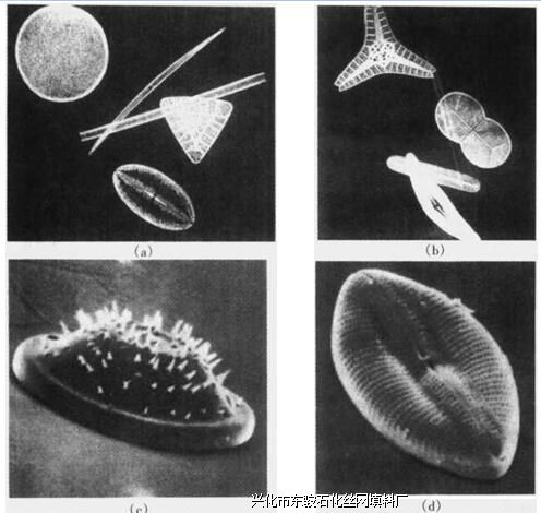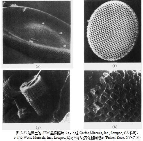 硅藻土是白垩质沉淀岩,由硅藻骨骼残骸组成。硅藻是生长在海洋中的单细胞水生植 物。图2-23为各种硅藻的照片。这些显微镜照片显示了各种硅藻复杂的结构,由此可以 解释为什么硅藻土有高空隙率,以及它们对液体凝胶化和流变性的影响。据估计有25000 多种硅藻。