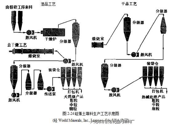 图2_24为不同品级硅藻土填料的生产方法。天然级产品为未爐烧粉末,将其压碎,依 颗粒尺寸分布大小分级即可。天然硅藻土屮含40%水分,在生产过程中,要将水分除去。 燧烧和热碱处理品级的产品在大窑中生产,釆用高温将硅藻颗粒烧结成球,但是,球中硅藻 的特征结构并没有变化。最后分类和包装西。