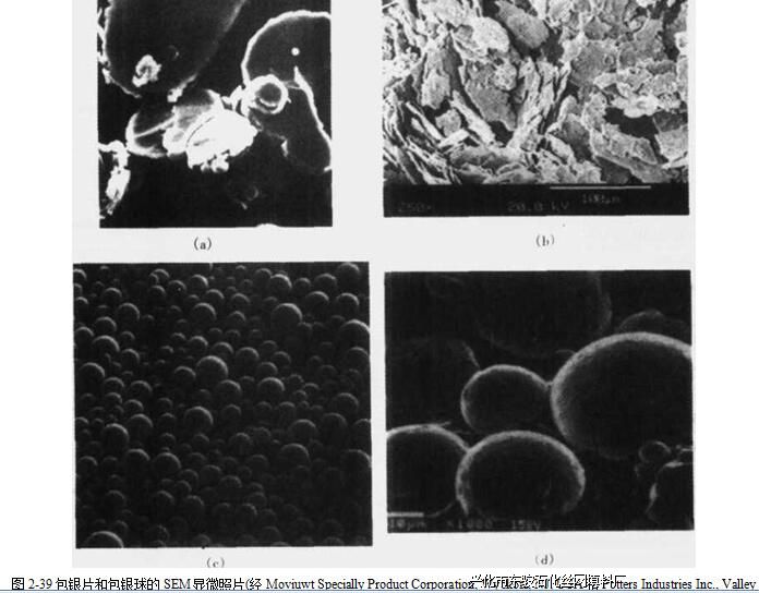 Novamet公司提出了一个新概念,即:通过在镣片上涂15%的银来改善镣片的性质。被 涂镣片兼具导电性和铁磁性。另外,因为密度不同(Ag为10.5g/cm3, Ni为8.9g/cm3),如此 可以节省15%的材料,因为导电率与体积有关,而不是与质量有关。而且通常表面导电率 是最重要的。图2-39为几种导电材料的形态。包银镣片和铜片为不规则形状,包银时为球 形,然后用机械压扁。图2-39中两个产品厚度明显不同,源于放大倍数不同。其实,两个 产品厚度相似,大约为1呻。涂层的均一性非常重要,因为银涂层还必须为铜防腐(镣有抗