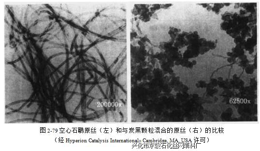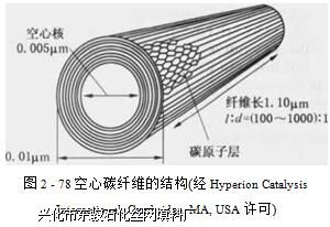 Hyperion Catalysis International开发出-•种新技术,能够生产中空碳原丝。该专利技术用丝网除沫器乙烯为原料催化生成直径非常小的中空原 丝。图2-78是该碳原丝的结构图。该原丝 的惊人之处是它的直径极小。一般来说, 达到与PAN基碳纤维填充产品相同的导电 率时,该丝网除沫器材料仅需八分之一,比钢纤维也 少三倍。产生这种性能的原因是该纤维有 高塑性,可以减少纤维的断裂,使纤维在 塑料基体中形成缠结结构。对于汽车和其 他应用中以碳纤维填充的部件的静电涂装, 正在努力使其简单化。