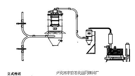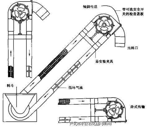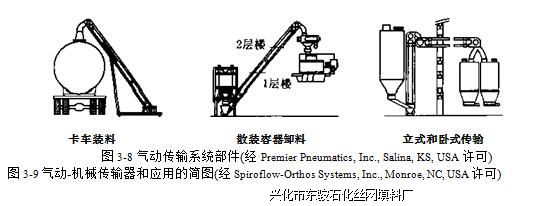 Spirofow - Orthos System, Inc.开发出数个机械和气动-机械传动系统,可增加现场操作 的灵活性,消除不必要的手工操作和粉尘。图3-9为气动-机械传输器的示意图,可在垂直、水平和有倾角状态下工作。传输器中钢缆串起的聚氨酯盘高速行进将物料传送到指定地 点。传输器规格决定物料传送速度,如:75mm型号的传送速度为300iymin; 100mm型为 600L/mino从细粉到颗粒物料都可以用该系统传送。图3-9还给出该传输系统典型的应用。
