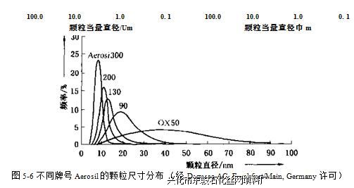 图5-6表明热致工艺可很好地控制颗粒尺寸分布和颗粒的平均尺寸。这些牌号的气相 二氧化硅有不同性质,由于小颗粒尺寸的填料更难以分散,所以要求釆用不同的技术方法 使之分散。同时,釆用较小颗粒尺寸的填料可得到更加透明的产品和更好的增强性。