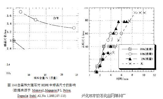 图10-8表示填料对球晶尺寸的影响。杰加填料时,HDPE的球晶尺寸是3.9叩;加入丝网除沫器填料时,随填料含量的增加,球晶尺寸逐渐变小7。