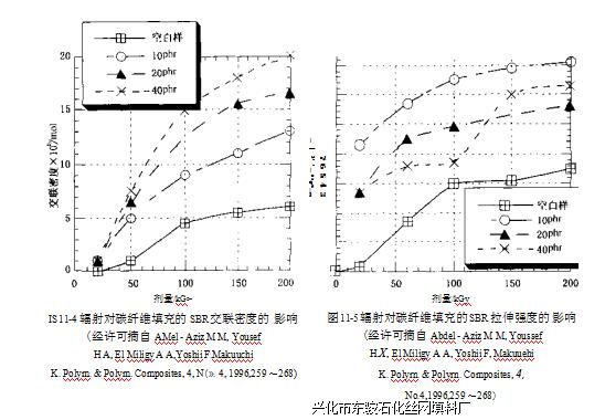 在LDPE中加入5%的粉煤灰,能较好地保持延伸率,材料在50-60kGy辐射下快速交 联,延伸率提髙3倍,而拉伸强度降低30%\炭黑填充的聚乙烯能抗离子辐射J"炭黑填 充的HDPE和HDPE/EPDM经过/ -射线辐射后冲击强度得到改善%
