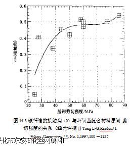 主要结果:图14-3表示碳纤维的接 触角对环氧复合材料层间剪切强度的影 响。碳纤维接触角增加(如官能团增加)使 得层间剪切强度增加卩。图14-4表明色 散分量(与正己烷有关)随处理时间不发生 变化,而极性分量(与乙二醇有关)随时间 变化。接触角变小表明表面自由能增加, 这正是碳纤维氧化处理所期望的结果气 图14-5表明,随着接触角降低,橡胶/ PU结合件的剥离强度升高。此橡胶样品中i含量不同。2含量越高,接触角越 小,粘结力越强",这与SEM研究结果一 致。SEM表明随着含量增加,表面粗 糙度增加,导致机械粘合性提高,从而剥离强度增加。