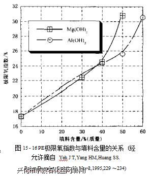 制备阻燃PE制品最常用的方法是加入 多元醇的磷酸三乙酯,也可用氢氧化镁替 代。图15-16所示为不同添加量的氢氧化 铝和氢氧化镁对PE极限氧指数的影响'第。 氧化镁对极限氧指数的提高效果更明显, 但两种填料均需大量填充才能达到应有的 效果,而大量填充后,材料的抗冲击性能 就会大大下降.在这类复合材料中加入硅 烷交联聚乙烯可以改善其抗冲击性。