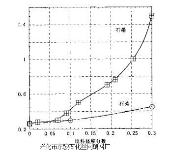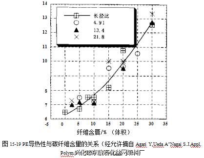 复合材料中的结构缺陷会严重影响其热传导性,这些缺陷包括空洞、未均匀分散的填 料、某些填料的团聚以及未浸润粒子等。图15-18所示为填料含量对PE热传导性的影响。 石墨是一种热导性材料,与石英相比,其用景很低就可提高材料的导电性。这些数据与理论 模型预测值相吻合38°图15-19所示为碳纤维的体积含量与长径比对导热性的影响⑷。用图 15-19与图15-17对比可以发现,与导电性依赖于碳纤维长径比不同的是,热导性仅与碳 纤维含量有关,并随其含量的增加而升高。