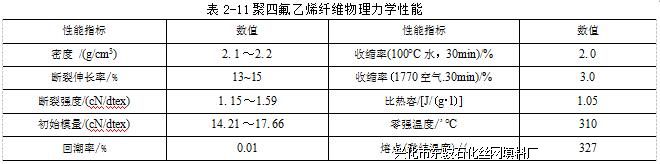 纤维一般为茶褐色,高温处理后为银灰色,王水处理后为白色。白色丝的电绝缘性好,电 阻率为10"Q・cm.褐色丝差一些。聚四氟乙烯纤维无任何毒性,但是在200°C以上使用时.可 能有少量氟化氢释放出来.因而应采取必要的劳防措施。其主要物理力学性能指标见表2-11。