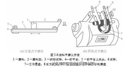 (1)平磨 平磨是利用往复式平磨仪或圆盘式平磨仪等仪器对滤料进行平磨测试,所用 仪器如图5-9所示。测定时,先根据滤料的规格与性能选择适宜的压力和规定的纱布,然后 固定好待磨试样,开机试验并记录磨损次数。