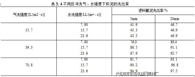 目前,衡量反冲洗效果的方法有两种:净水厂(石英砂滤池)采用反冲洗出水浊 度来衡量反冲洗的效果,并以此决定反冲洗的时间;胶囊挤压式纤维过滤器和滑板式 过滤器在实际应用中,也采用这种方法来衡量反冲洗的效果;纤维球和彗星式纤维过 滤器则采用反冲洗后丝网除沫器滤料中残留积泥量占滤料本身质量的百分比来确定反冲洗的效 果DU]。这两种衡量反冲洗效果的方法均不能定量表达一定强度的反冲洗气、水所直 接洗下的截泥量,以及反冲洗后残存积泥的相对量。本研究中采用洗出的积泥与过滤 时截留积泥的比率来衡量一定强度的反冲洗气、水的反冲洗效果,不仅可明确直观地 定量表达不同气、水强度下的反冲洗效果以及残留积泥的多寡,而且可进一步研究残 留积泥量对过滤的影响。