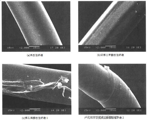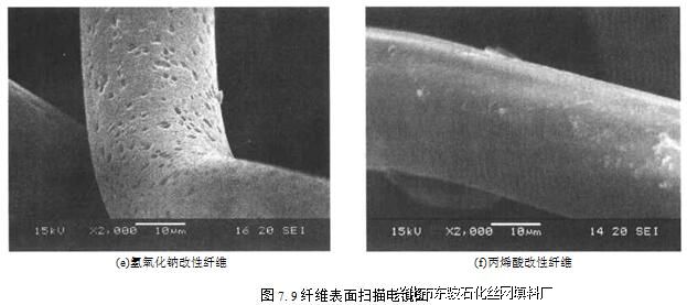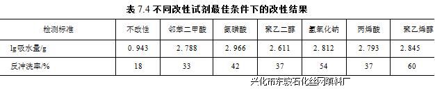 表7.4为最佳改性条件下的实际改性结果。对比可知,经亲水改性后的纤维,吸水量与反冲洗率都有一定的提高,改性试剂不同,丝网除沫器提高程度也有差异。综合看来,大分子亲水化及接枝共聚两种方法的改性效果不及亲水整理明显。分析认为,前两种改 性方法提高亲水性主要依靠亲水基团的接入,但由于纤维表面的惰性使得接入基团数 量有限。而亲水整理能在纤维表面形成连续致密的亲水膜,亲水性可大幅增强。